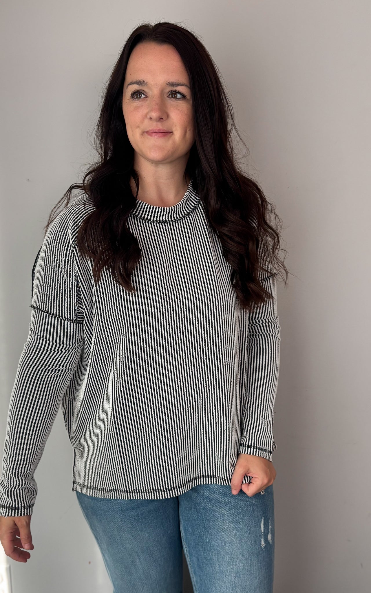 This top features our favorite deep ribbed material. It runs a little roomy.