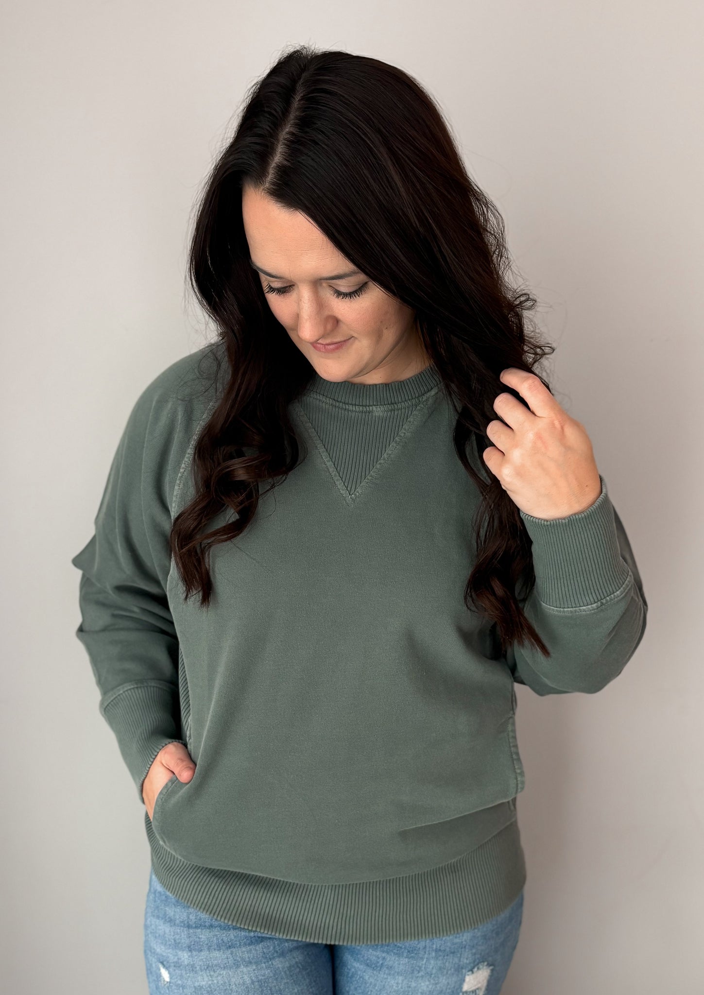 This dark washed jaded pocket pullover is light weight and runs oversized. Can definitely size down one and still have a roomy fit or stay true to size and it’s oversized! These pullover’s have been a fan favorite for YEARS for a reason! Did I mention pockets?!