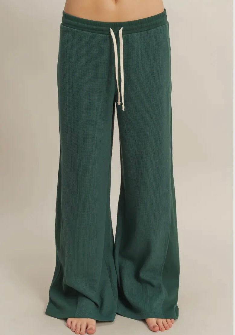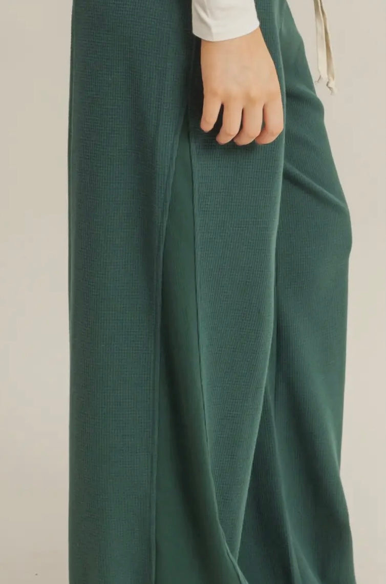 These wide leg pants feature a baby waffle knit texture and a. side patchwork detail. These run oversized, model is in a small